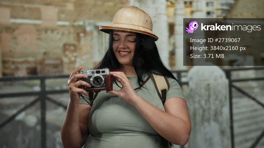 Young woman tourist with camera in front of roman ruins in rome, capturing her travel moments, showcasing her adventurous spirit.