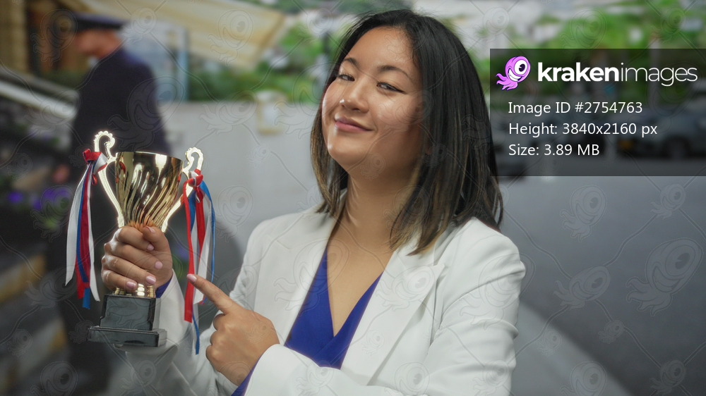 Young woman triumphantly holding trophy cup on city street showcasing success and achievement outdoors with smiling expression and modern urban backdrop. - Kraken Images