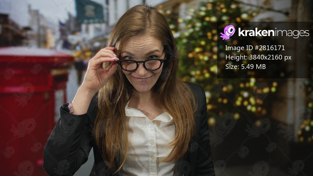 Young woman uses hand to adjust glasses on street outside building decorated with lights and garlands; confidence.