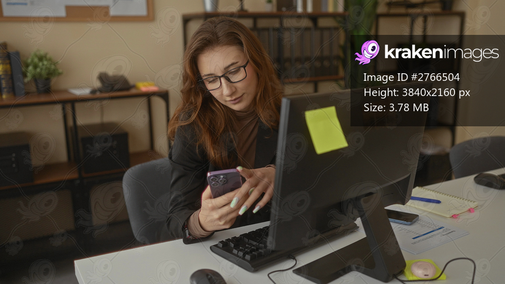 Young woman using smartphone in modern office with computer and shelving in background enhancing a professional workplace atmosphere indoors.