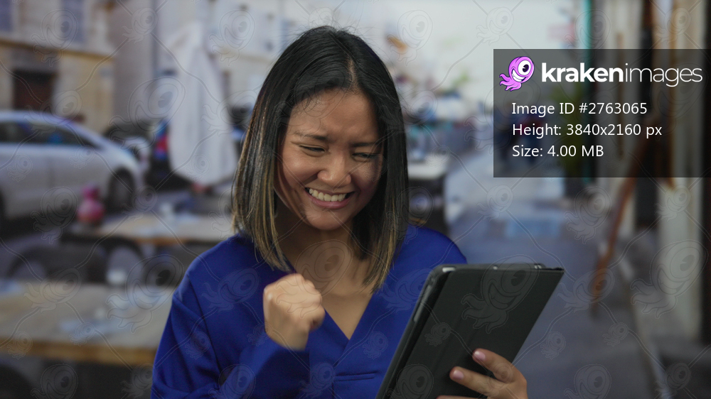 Young woman using tablet on outdoor city restaurant terrace, expressing joy and focus, with urban street background evident.