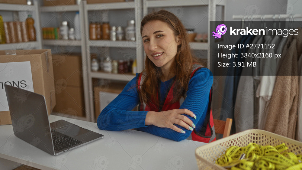 Young woman volunteer at a charity donation center sits near a laptop, surrounded by clothes and supplies, radiating warmth and dedication.