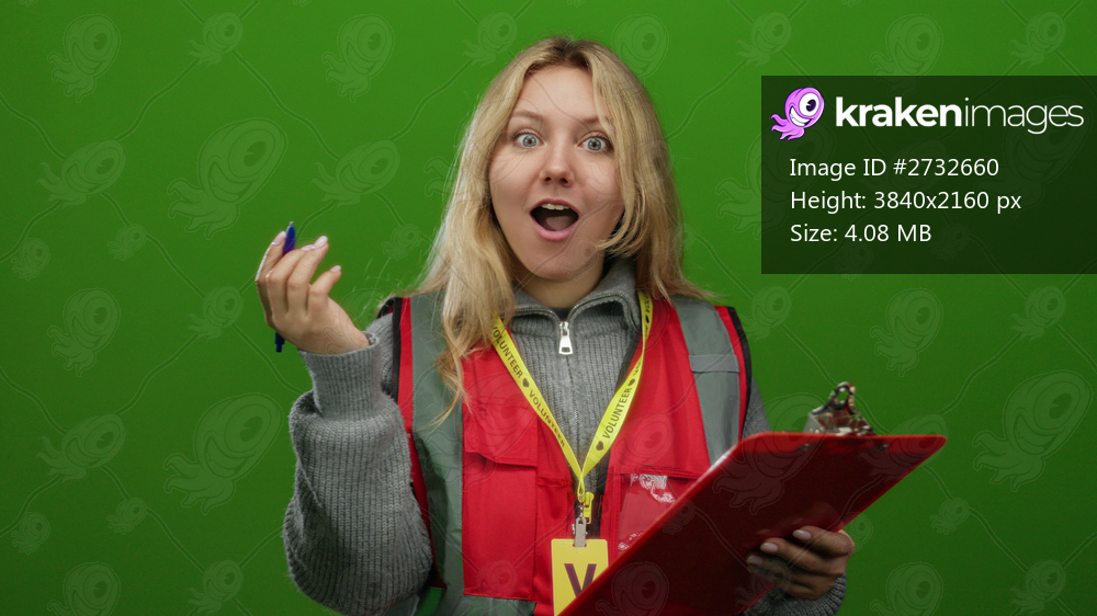 Young woman volunteer with blonde hair in red vest holding clipboard and pen over green background wall, expressing surprise or excitement.