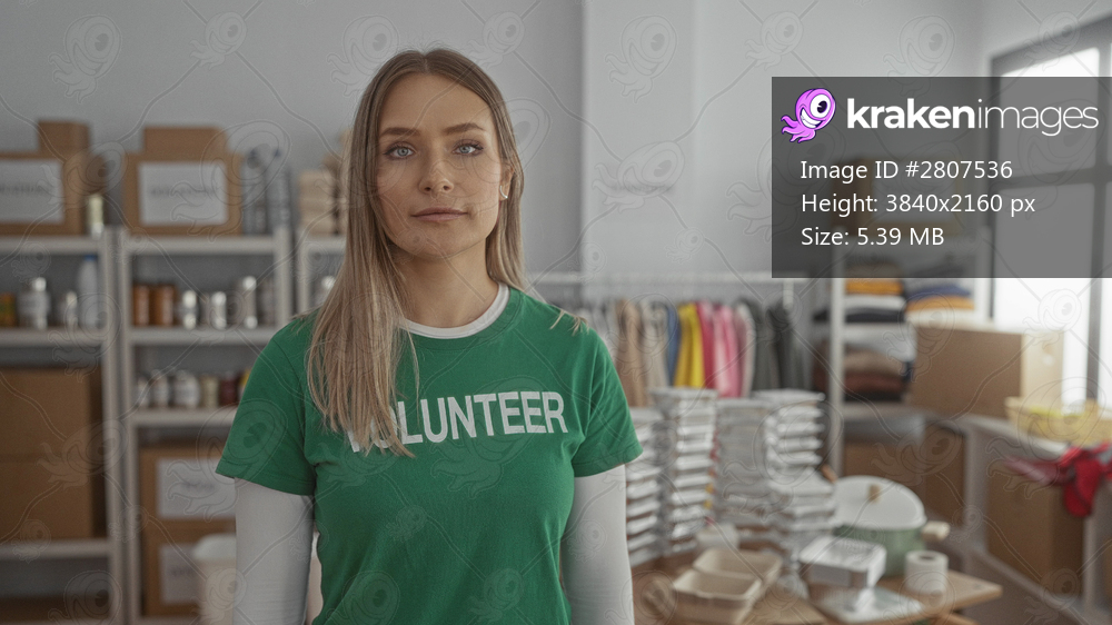 Young woman volunteer with blonde hair standing in a donation center surrounded by boxes and supplies indicating charity work.