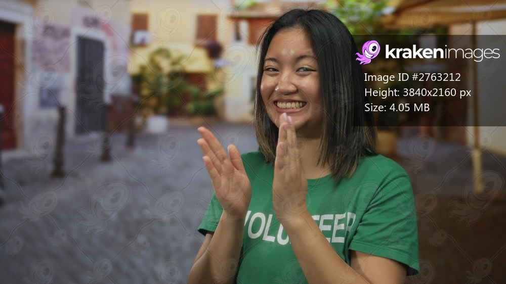 Young woman volunteer claps on a city street wearing a green t-shirt outside, capturing a cheerful and vibrant moment in an urban setting.
