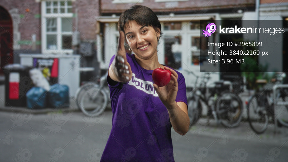 Young woman volunteer extends hand for handshake while holding a red heart and wearing a purple volunteer shirt on a street; community care hopeful.