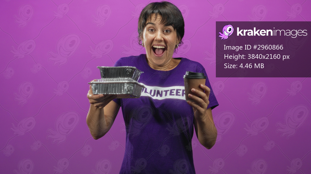 Young woman volunteer holding aluminum meal trays and coffee cup, smiling with mouth open in studio; community service joy.