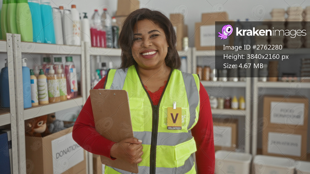 Young woman volunteer in a reflective vest holds clipboard inside donation center surrounded by boxes and products, showcasing dedication to charity work in a supportive environment. - Kraken Images