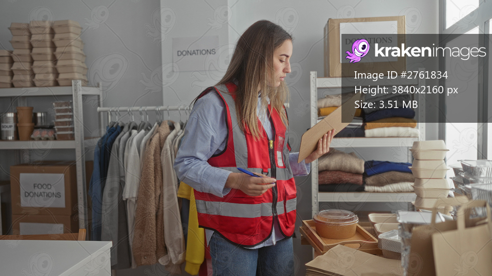Young woman volunteer in charity center taking notes surrounded by donations of clothes and food packages, wearing a reflective vest indoors.