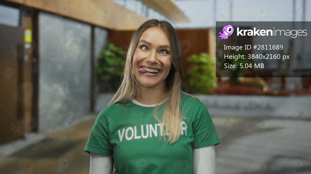 Young woman volunteer in green shirt smiling outdoors on a city street with plants and buildings in the background showcasing positive community spirit. - Kraken Images