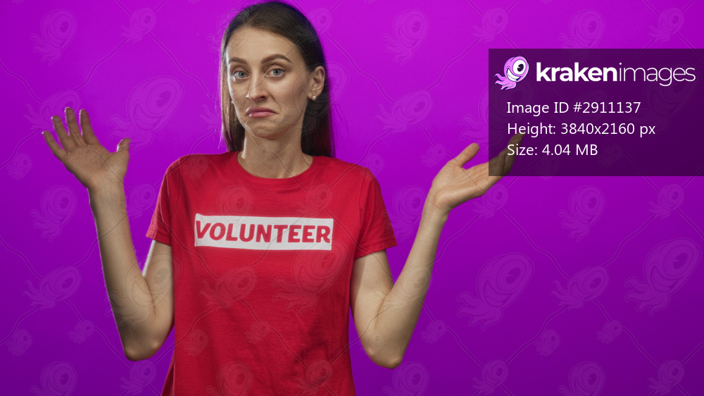 Young woman volunteer in red volunteer tshirt with hands raised palms up shrug gesture in purple studio; uncertain doubt.
