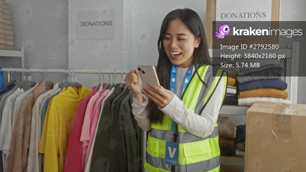 Young woman volunteer in reflective vest uses smartphone in charity center surrounded by donations and clothing racks indoors.