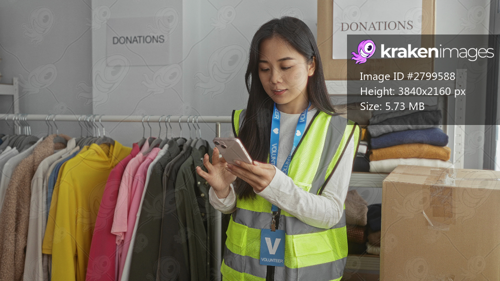 Young woman volunteer in reflective vest uses smartphone in charity center surrounded by donations and clothing racks indoors.