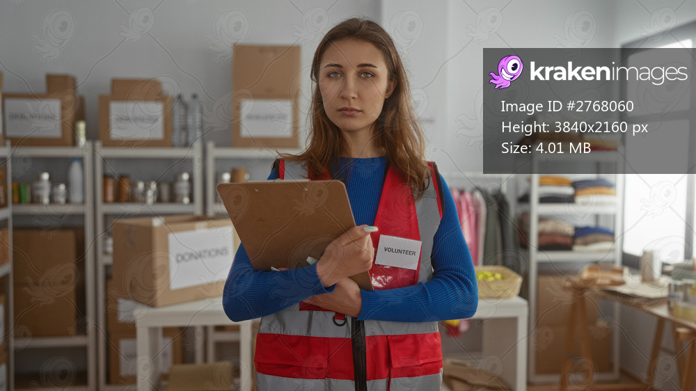 Young woman volunteer organizing donations in a charity center room surrounded by boxes and shelves.