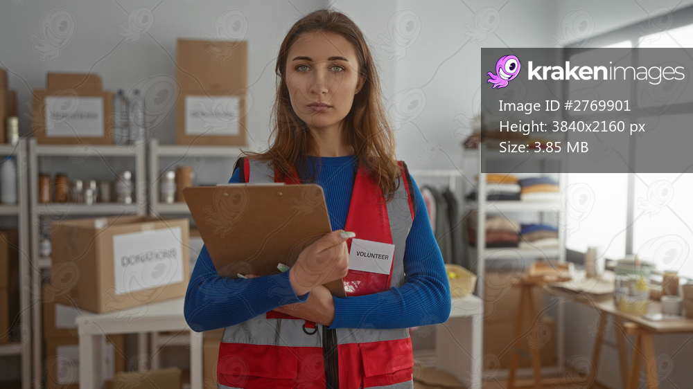 Young woman volunteer organizing donations in a charity center room surrounded by boxes and shelves.
