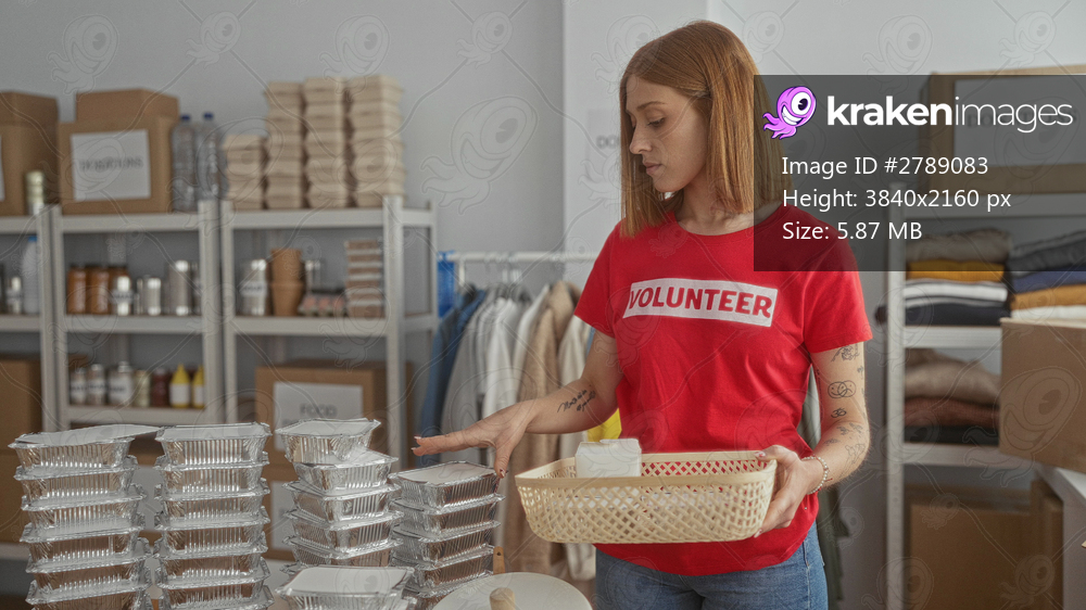 Young woman volunteer organizing supplies in an indoor donation center, wearing a red shirt and surrounded by shelves of food and clothing donations.