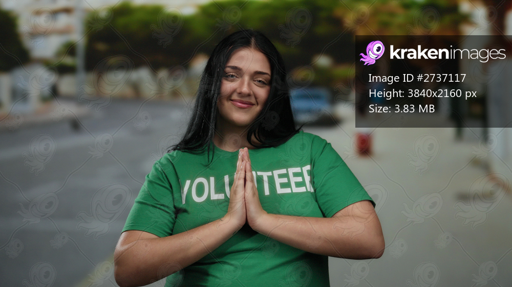 Young woman volunteer smiling outdoors in city street wearing green t-shirt with volunteer text, showcasing community spirit and diversity.