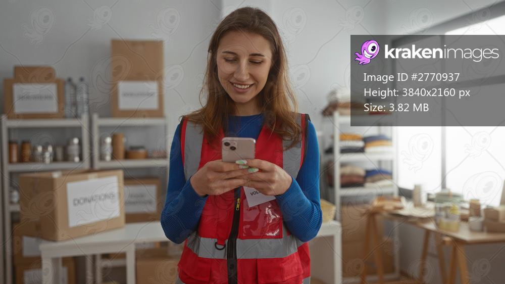 Young woman volunteer using phone in charity donations center room with boxes in the background showcasing a community support environment indoors.