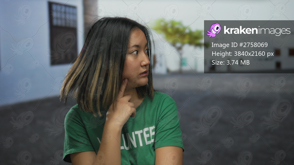 Young woman volunteer wearing green shirt stands outdoors in city street looking concerned and contemplative with blurred background of buildings on an overcast day. - Kraken Images