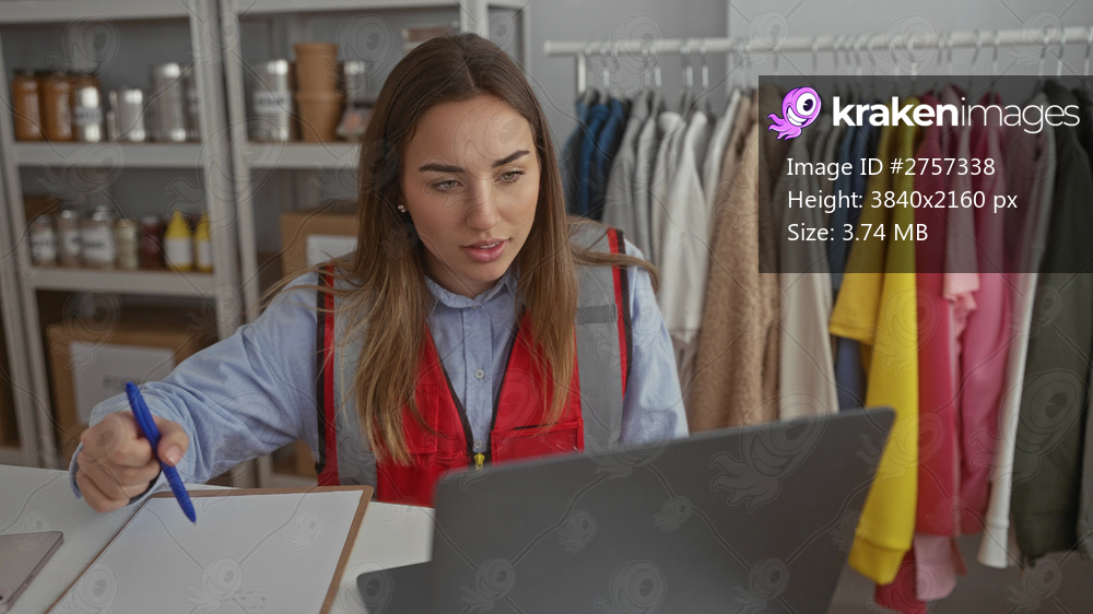 Young woman volunteer working at indoor charity donations center using a laptop surrounded by clothing and supplies