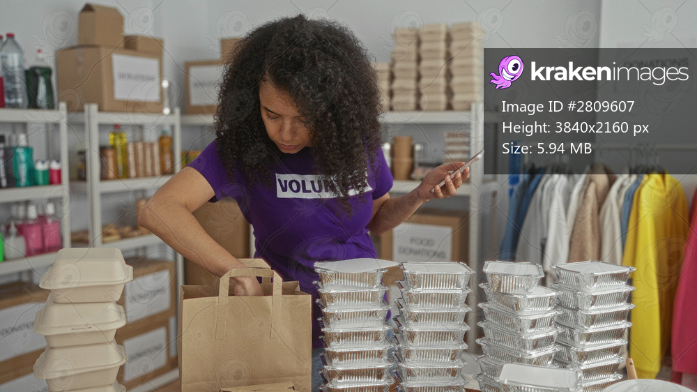 Young woman volunteering indoors at a charity center, packing food into bags with stacked containers and clothing donations visible around the room.