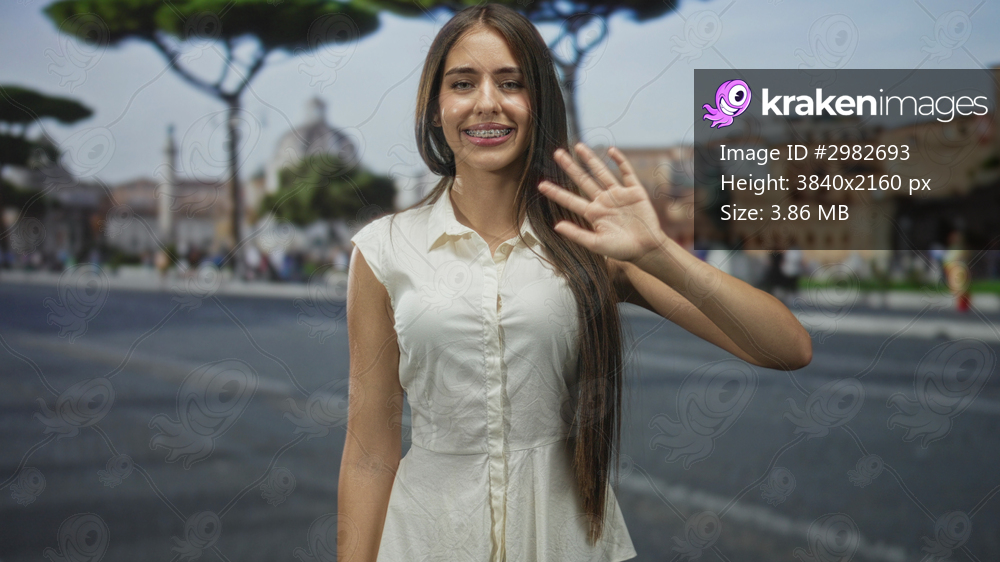Young woman waves hand and smiles, braces visible, standing on a busy street in front of an ancient domed building and umbrella pines; friendly greeting. - Kraken Images