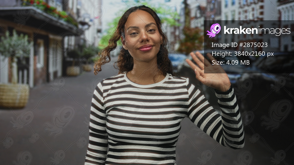 Young woman waving hand on city street in a striped top, smiling with relaxed posture amid parked cars and storefronts; contentment.