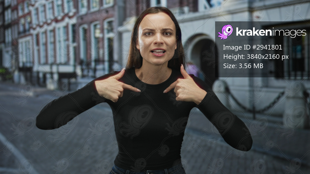 Young woman waving hands and speaking with raised hands on cobblestone street by building facade; frustration.