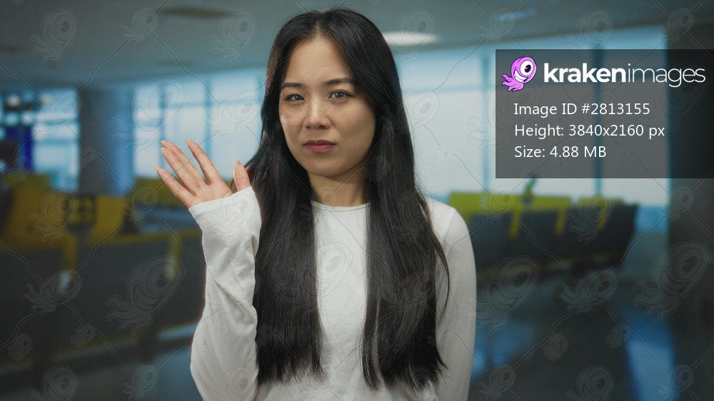 Young woman waving indoors at airport terminal with bright window and empty seating, wearing casual clothes and displaying a calm expression.