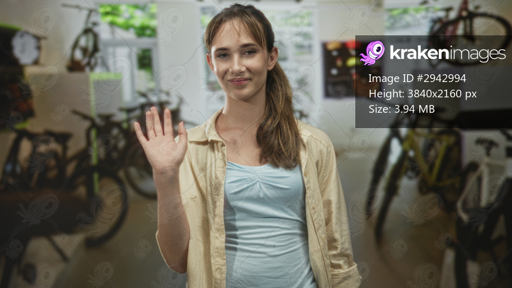 Young woman waving right hand in a bike shop building aisle, smiling toward camera with casual shirt and ponytail; friendly greeting.