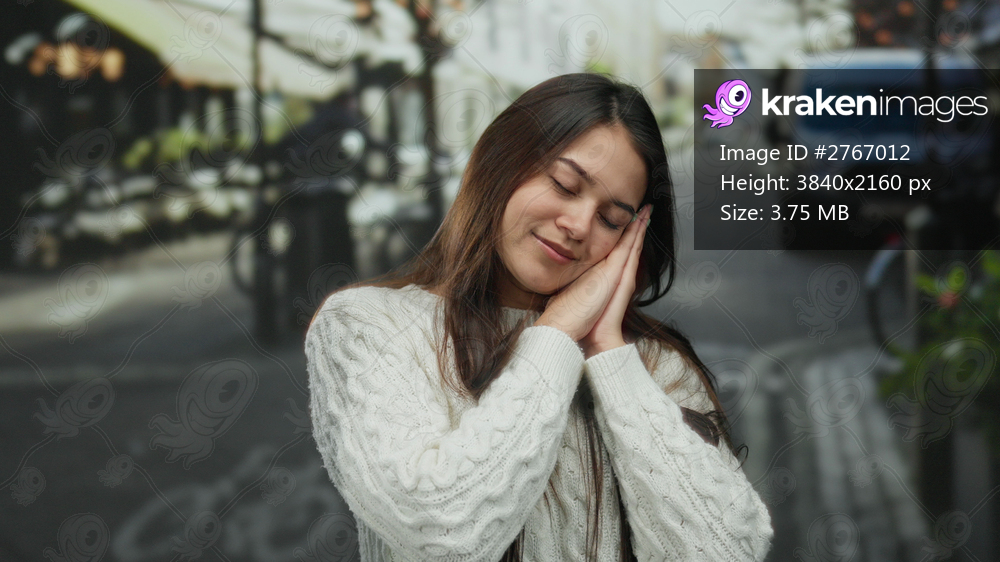 Young woman wearing a cozy sweater stands smiling and relaxed with hands together as if sleeping on a street with soft light and an out-of-focus urban background. - Kraken Images