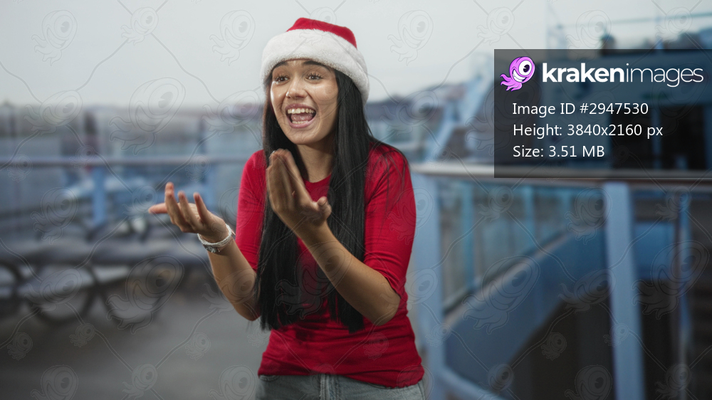 Young woman wearing a santa hat laughing with hands mid gesture on a cruise ship deck; holiday joy.