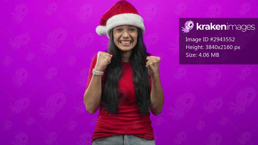 Young woman wearing a santa hat and red shirt clenches fists and smiles with visible excitement in a studio; holiday joy.