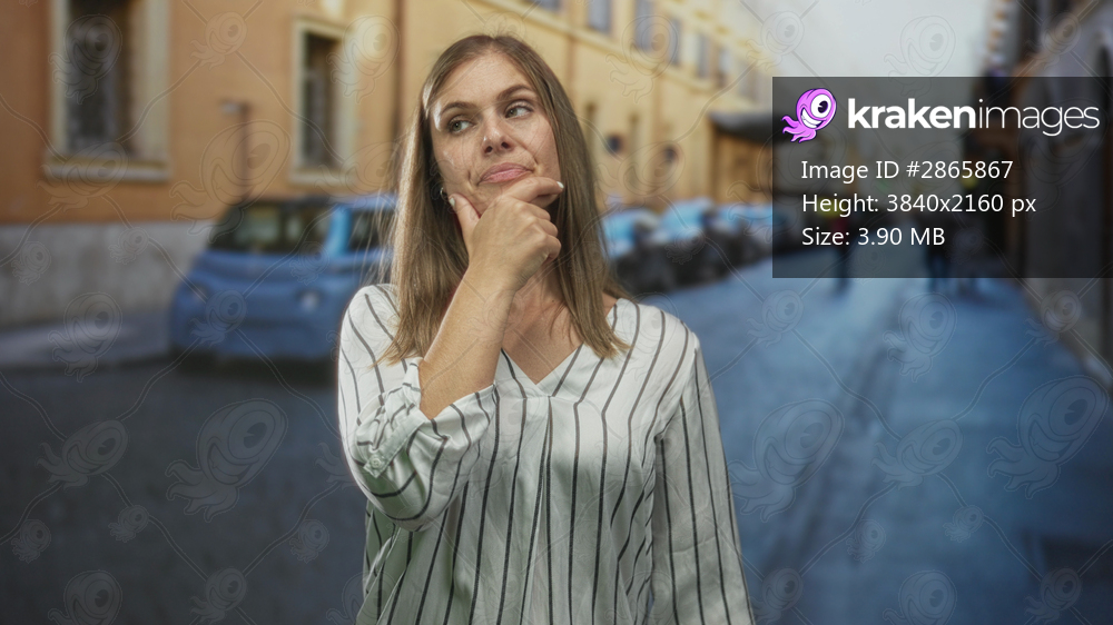Young woman wearing a striped shirt rests hand on chin on street lined with parked cars and old buildings; contemplation.