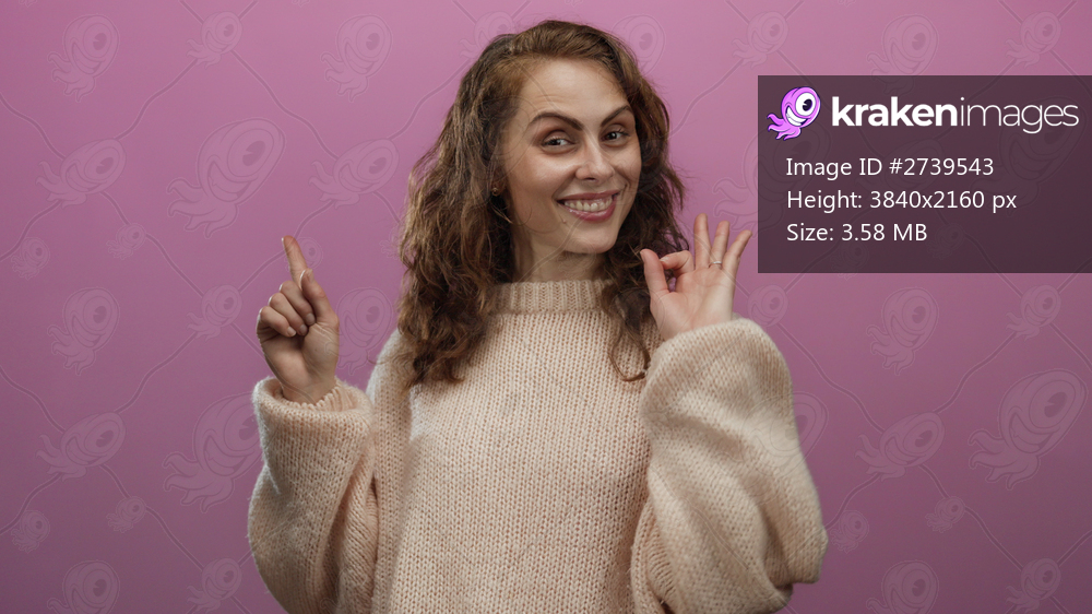 Young woman wearing a sweater gesturing okay and pointing against a pink background, conveying positivity and simplicity in a fresh studio setting.
