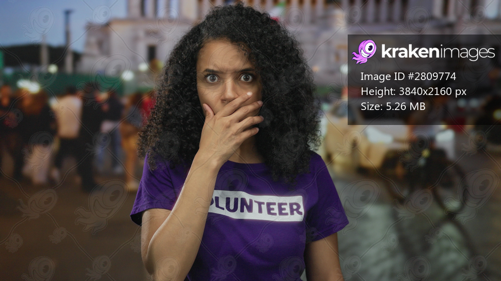 Young woman wearing a volunteer shirt stands on a bustling street at night, surrounded by people and city lights capturing an outdoor urban scene.