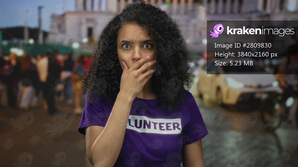 Young woman wearing a volunteer shirt stands on a bustling street at night, surrounded by people and city lights capturing an outdoor urban scene.