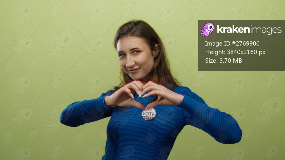 Young woman wearing a vote badge stands against a yellow background making a heart shape with her hands, symbolizing support and civic engagement in united states elections. - Kraken Images