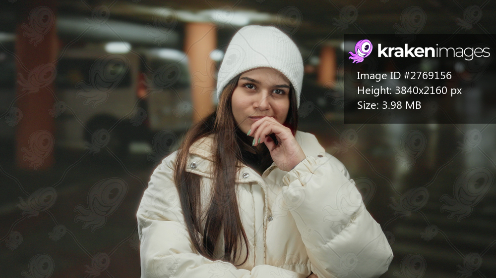 Young woman wearing a white jacket and beanie stands in an indoor parking lot with cars in the background, exuding a thoughtful expression.