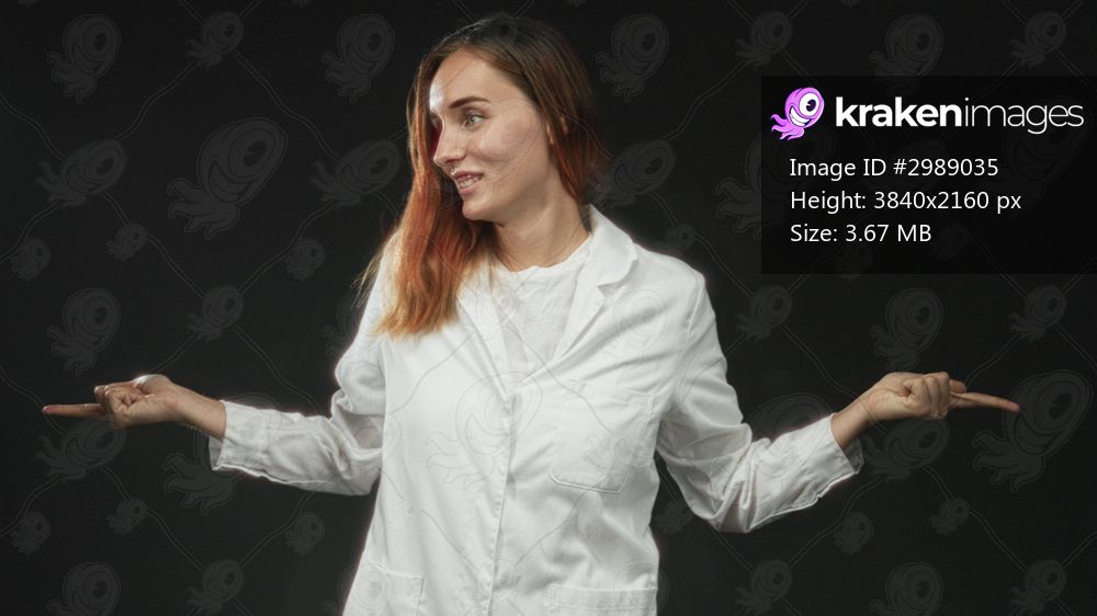 Young woman wearing a white lab coat points both index fingers outward while smiling toward camera in a studio with black backdrop; playful curiosity.