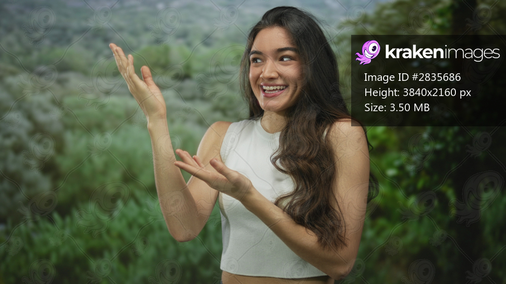 Young woman wearing a white tank top, smiling, shows open palms in a forest clearing; joyful greeting.