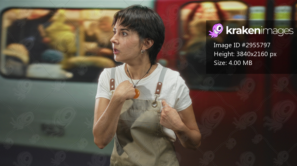 Young woman wearing apron points both fingers to her chest on a metro platform inside a building; surprise confusion.