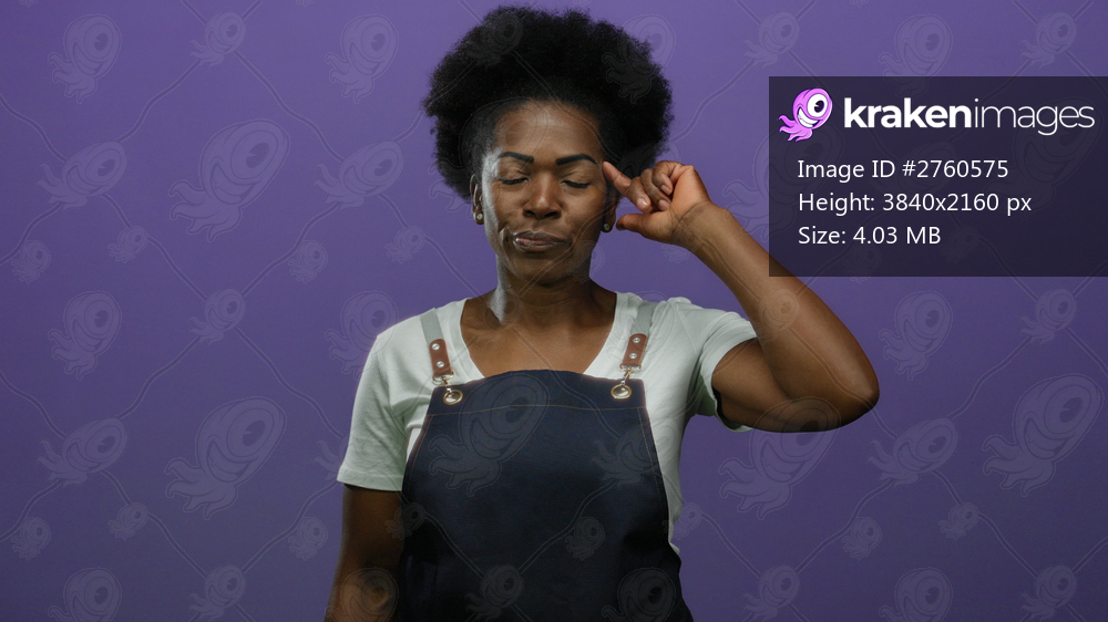 Young woman wearing apron points finger at her head with closed eyes against a vibrant purple background, conveying confusion or thoughtfulness with an isolated expression. - Kraken Images