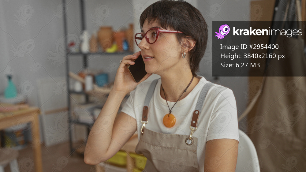 Young woman wearing apron and red glasses holds phone to ear and smiles while seated at a pottery table with clay tools and shelves in a studio; contentment. - Kraken Images
