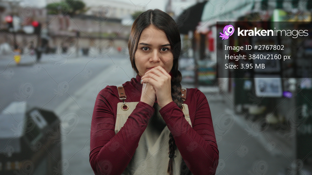 Young woman wearing apron standing on busy street showing thoughtful expression in urban outdoor environment with colorful storefronts.