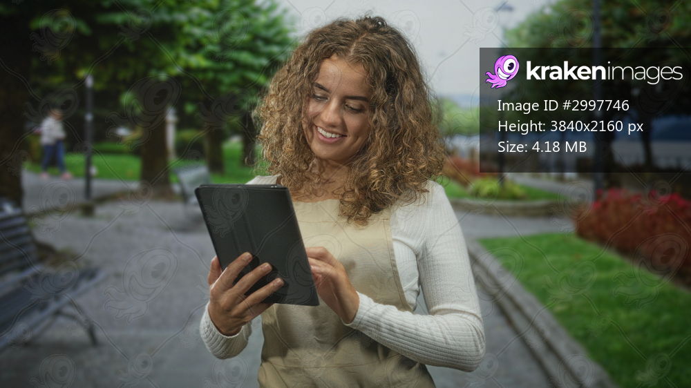 Young woman wearing apron and sweater holding tablet, tapping screen with finger while smiling on a street promenade; calm contentment.