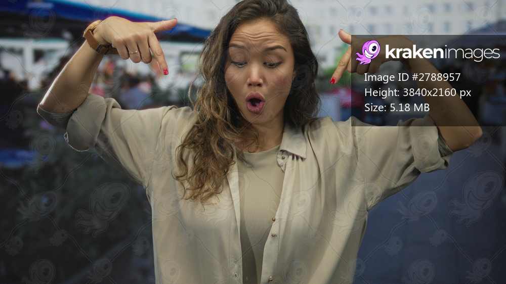 Young woman wearing beige shirt pointing both index fingers down toward camera on outdoor terrace; surprise.