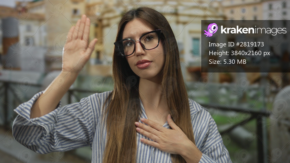Young woman wearing black glasses raises hand and places hand on chest at roman ruins outdoors by ancient pillars; duty.