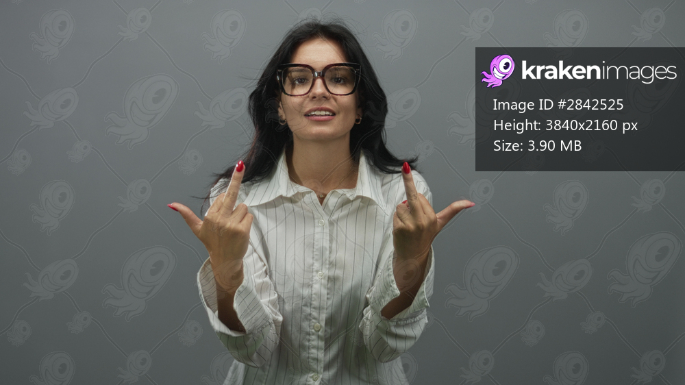 Young woman wearing black glasses showing middle finger gesture with red nails in grey studio; defiance anger.