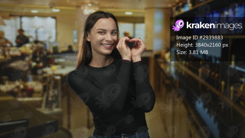 Young woman wearing black long sleeve top smiling with hands forming heart in building restaurant near counter and bar; affection warmth.